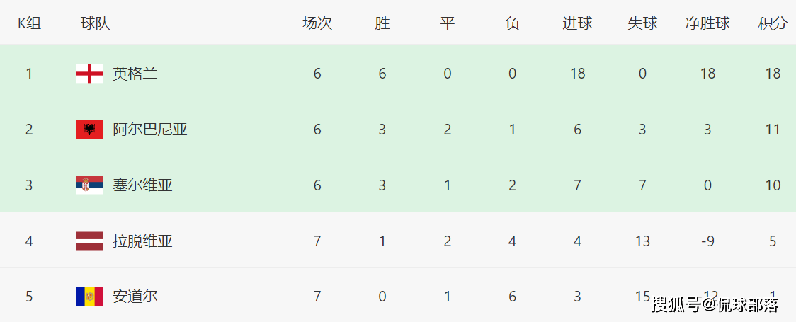 作为老牌强队,英格兰分到了K组,跟塞尔维亚、阿尔巴尼亚、拉脱维亚、安道尔同个小组。比起意大利的逐渐没落,英格兰在世预赛上的表现非常稳定,前5轮积15分,坐稳小组第一,同时甩开身后的阿尔巴尼亚6轮积11分,塞尔维亚5轮积7分,出线形势一片大好。