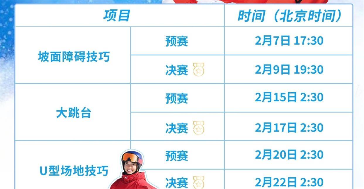 具体赛程时间已经明确。 大跳台预赛定于2月15日凌晨2点30分,决赛在2月17日凌晨2点30分。 U型场地技巧预赛在2月20日凌晨2点30分,决赛在2月22日凌晨2点30分。 这些时间点对中国观众来说确实不够友好,特别是大跳台决赛恰逢大年初一凌晨。