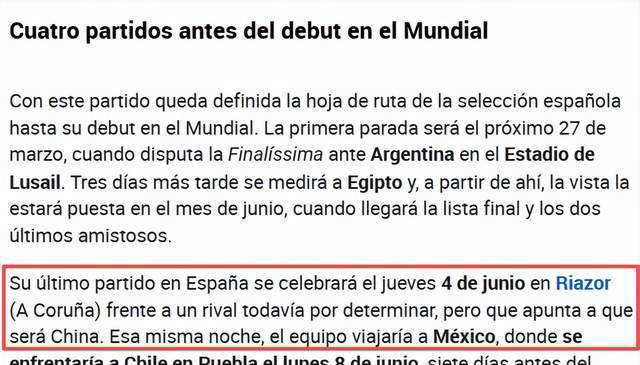 紧接着进入6月份,西班牙将在6月4日和6月8日分别进行两场热身赛,其中6月8日的对手已经确定是来自南美的智利,比赛地点为墨西哥普埃布拉。而6月4日那场比赛的对手尚未最终确认,但据消息指出,很有可能是中国男足。若此事成真,踢完这场比赛后,西班牙球队将立即飞赴墨西哥,为接下来的世界杯做好充足准备。