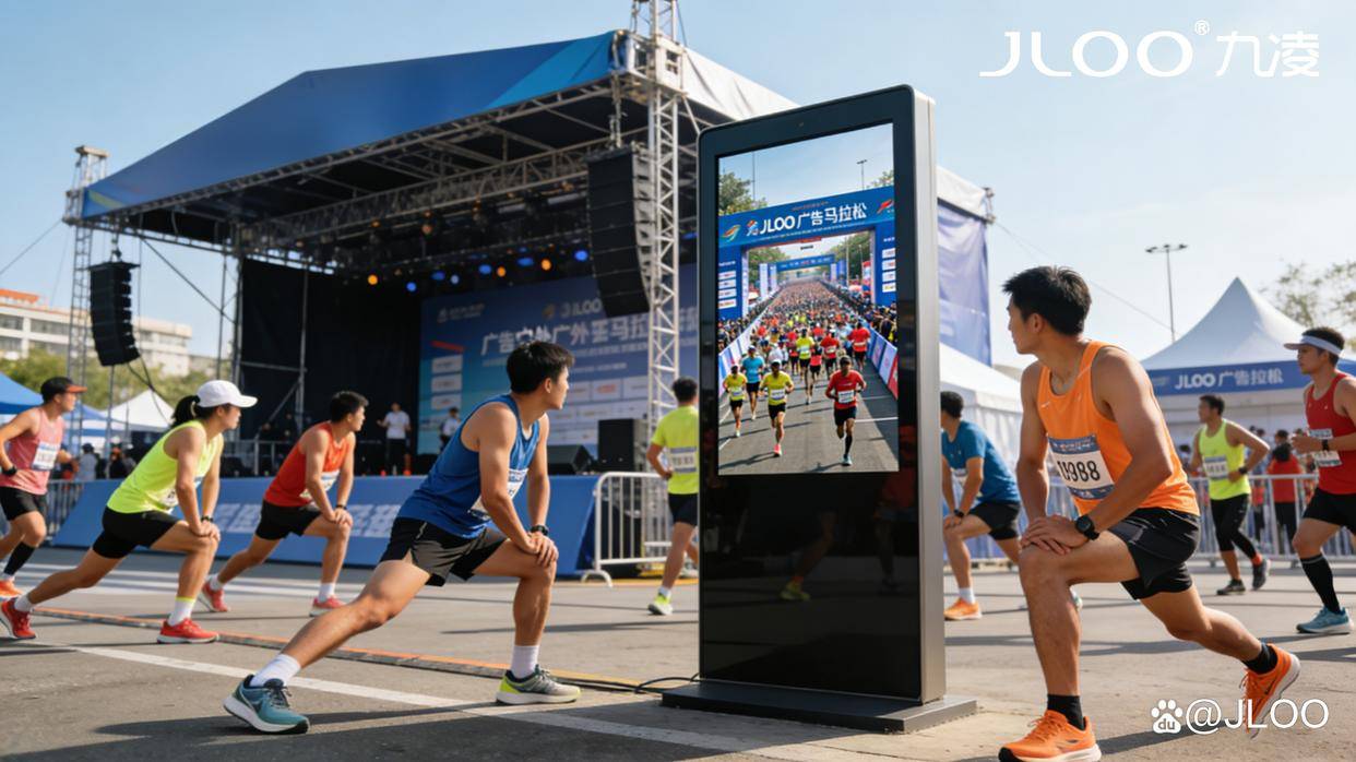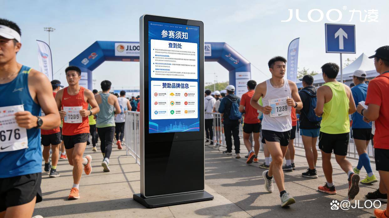 马拉松起点的氛围营造,核心在于“聚气、暖心、提势”,既要点燃跑者的参赛热情,也要让现场观众感受到赛事的活力与温度,更要为赛事打造专业、有序的整体质感。九凌JLOO户外广告机凭借全场景适配能力与多元功能优势,成为起点氛围营造的“隐形操盘手”,从视觉冲击到实用服务,全方位筑牢赛事氛围感根基。